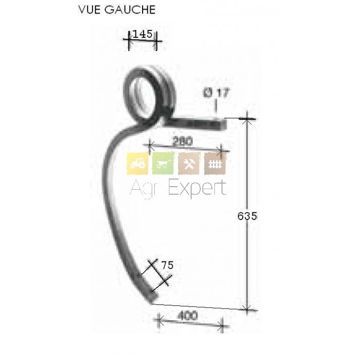 Dent de cultivateur double spire 35x35 H635 sous bâti EA75 grand dégagement gauche