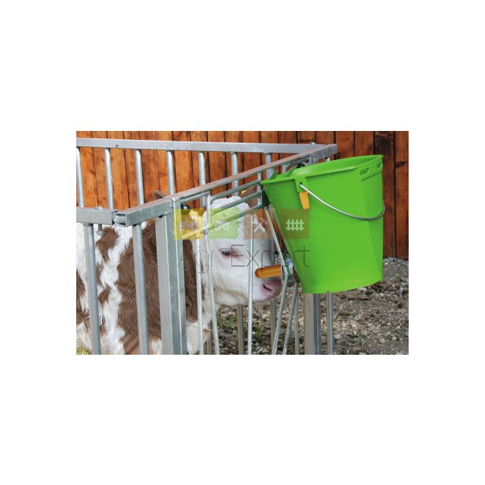 La soupape hygiénique avec mécanisme rabattable permet de réduire le nombre de germes dans l'environnement et d'assurer une croissance saine des veaux. La soupape hygiénique remplace les clapets anti-retour à bille. Le raccord amovible simplifie et facilite le nettoyage, facilement réalisable avec une brosse ronde. La tétine se démonte en un clin d'œil grâce à une fermeture à baïonnette. Le support de séchage est fixé latéralement sur les supports des anses et permet l'égouttage et le séchage de la soupape et de la tétine. Abreuvoir avec étrier mécanique. L'abreuvoir résiste aux acides, peut être mis en contact avec les aliments. Il est sans cadmium. Facile d'entretien. Vous pouvez le fixer grâce au dispositif d'accrochage zingué vendu séparément sous la référence KER1410. Vendu par lot de 5 seaux.
