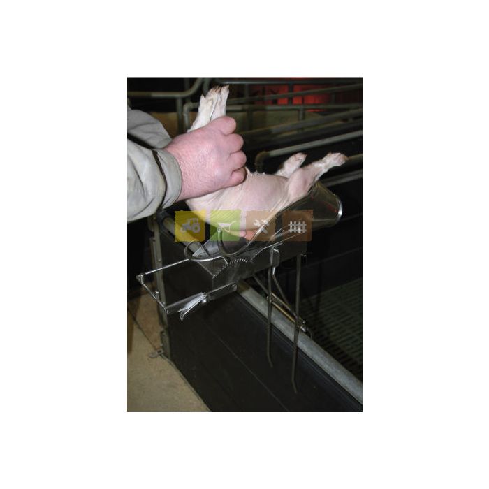 Cet appareil à castrer peut être monté sur les cloisons de séparation des boxes. Le porcelet est posé sur le dos, sa tête est bloquée et ses pattes arrières attachées avec la partie arrière du corps qui est tendue. La castration peut être faite par une seule personne. Cet appareil peut être utilisé pour couper les queues ou pour des interventions vétérinaires. L'utilisation est hygiénique et le nettoyage facile, car tout est en inox. Livré sans support qui est vendu séparément.