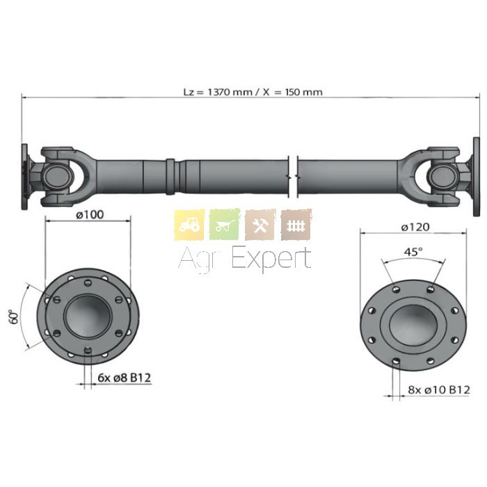 Arbre de transmission réglable 1370-1520 mm avec poussée 150 mm pour engins Weidemann 1160, 1250, 1260 6 ou 8 trous, Ø perçage 8/10 mm.