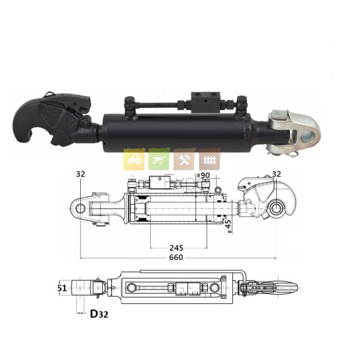 Barre de poussée hydraulique 12T crochet Cat3 genouillère D32, entre-axe 660/890 mm