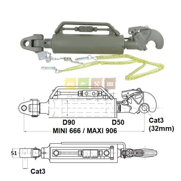 Barre de poussée hydraulique 12T crochet Cat3 genouillère D32, entre-axe 666/906 mm avec flexibles et prises