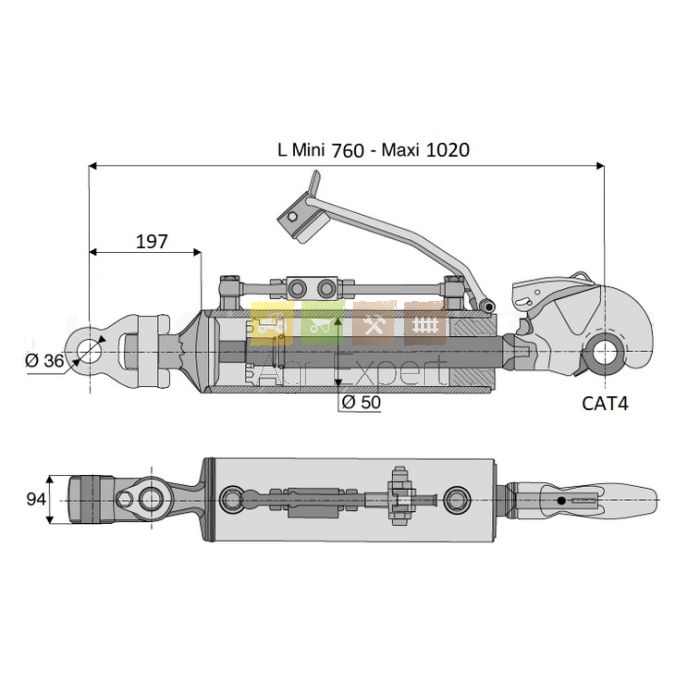 Barre de poussée hydraulique crochet Cat4 genouillère Ø36, entre-axe 760/1020 mm pour tracteur New-Holland TG, T8, T9, Case Magnum