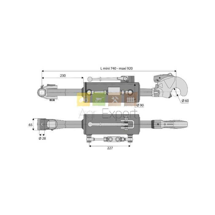 Barre de poussée hydraulique L 740/920, crochet Cat3 et articulation Ø 28 mm