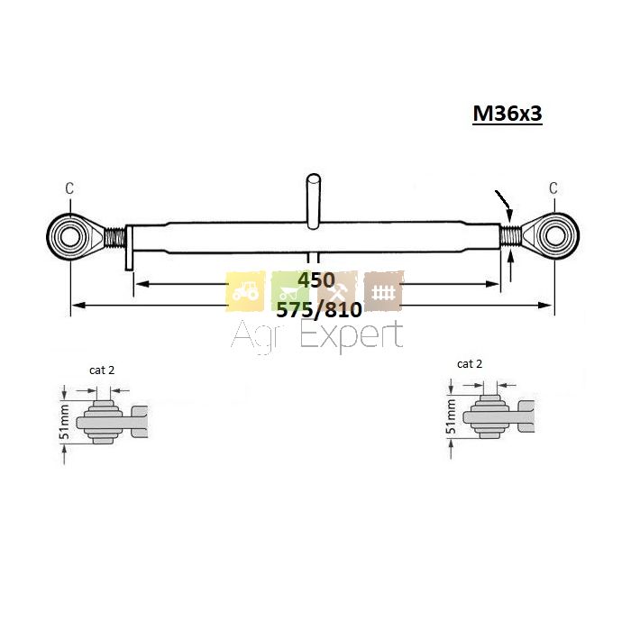Barre de poussée lourde M36x3 longueur 575/810 mm rotule D25.4, tracteur toute marque