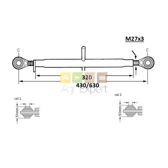 Barre de poussée M27x3 longueur 430/630 mm rotule et D25.4, tracteur toute marque Jusqu'à 85CV.
