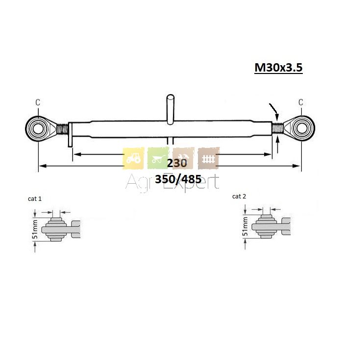 Barre de poussée M30x3,5 longueur 350/485 mm rotule D19, D25.4, tracteur toute marque Jusqu'à 85CV.