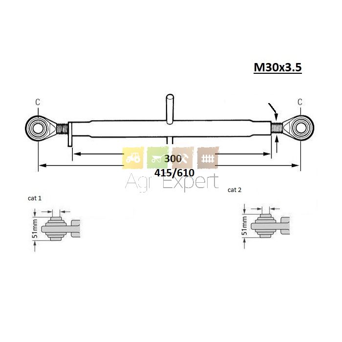 Barre de poussée M30x3,5 longueur 415/610 mm rotule D19, D25.4, tracteur toute marque Jusqu'à 85CV.