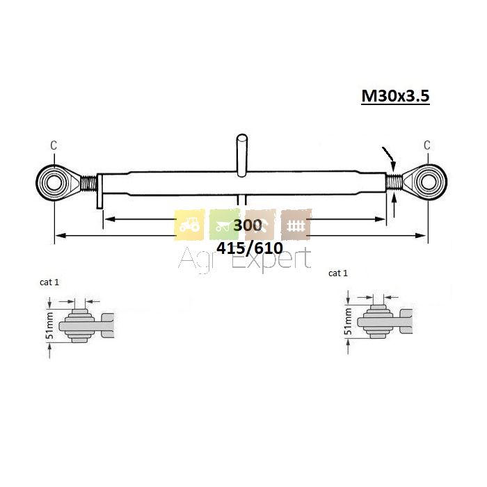 Barre de poussée M30x3,5 longueur 415/610 mm rotule D19, tracteur toute marque Jusqu'à 85CV.
