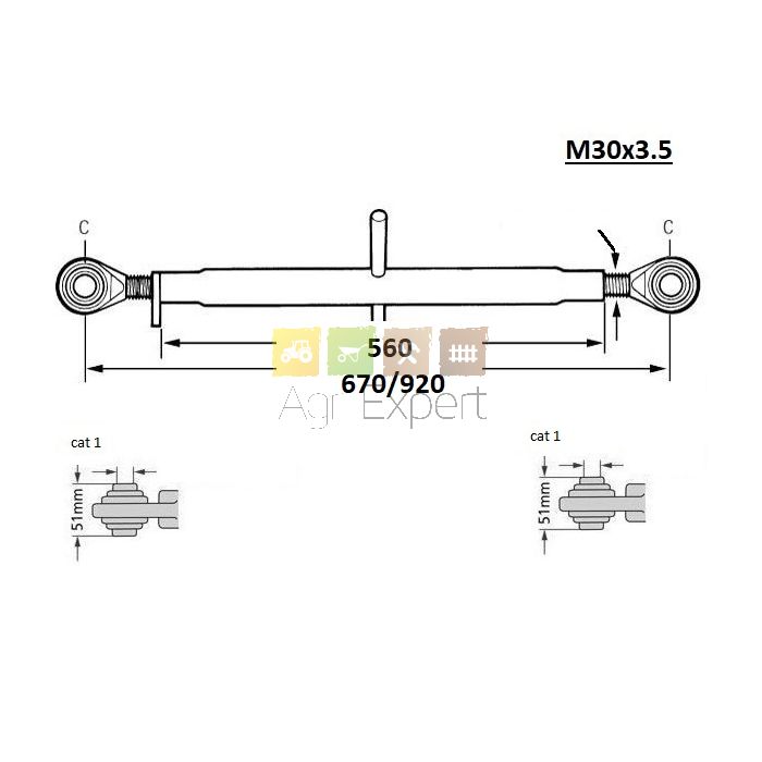 Barre de poussée M30x3,5 longueur 670/920 mm rotule D19, tracteur toute marque Jusqu'à 85CV.