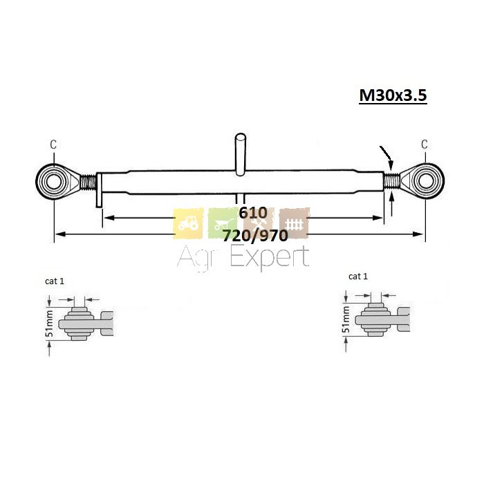 Barre de poussée M30x3,5 longueur 720/970 mm rotule D19, tracteur toute marque