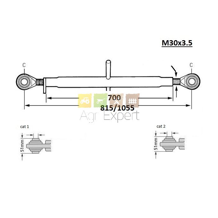 Barre de poussée M30x3,5 longueur 815/1055 mm rotule D19, D25.4 tracteur toute marque Jusqu'à 85CV.