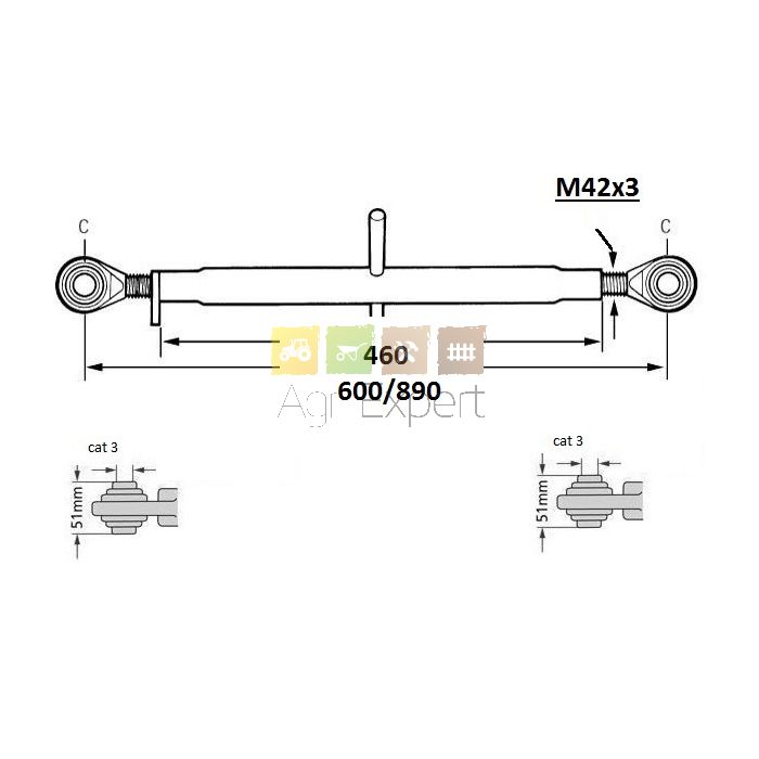Barre de poussée très lourde M42x3 longueur 600/890 mm rotule D32, tracteur toute marque