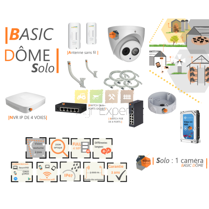 Pouvant aller jusqu'à 4 caméras, ce KIT 1 caméra peut être completé par d'autres caméras Visio Expert pour augmenter la surveillance de votre exploitation.