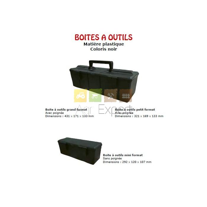 Boite à outils noire en matière plastique avec poignée. Modèle grand format : 431 x 171 x 133 mm. Modèle moyen format : 321 x 169 x 133 mm. Mini modèle : 292 x 120 x 107 mm.