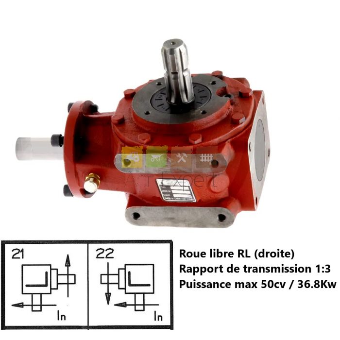 Boitier renvoie d'angle R1:3 avec roue libre - puissance max 50cv / 540Tr/min arbre d’entre 1"3/8 6 cannelures type Comer : T311J, 9.311.746.00, 311874