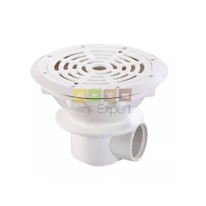 Bonde de fond piscine Ø 210 mm en ABS blanc avec grille d'aspiration vissée, Sortie latérale filetage Ø 2", Débit maximal : 13 m3/h Astralpool