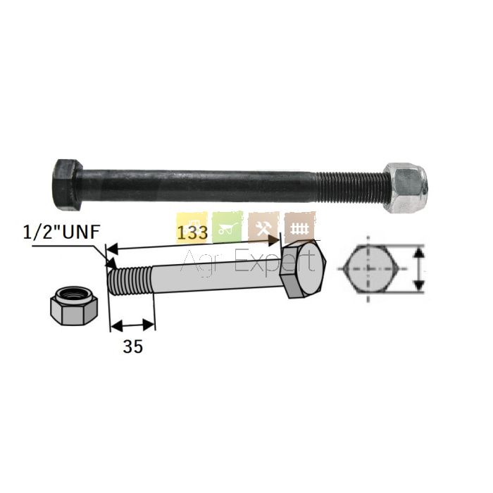 Boulon 1/2x133 UNF avec écrou pour marteau de broyeur Agrimaster, Bomford, McConnel, 1/2" UNF x 133 mm