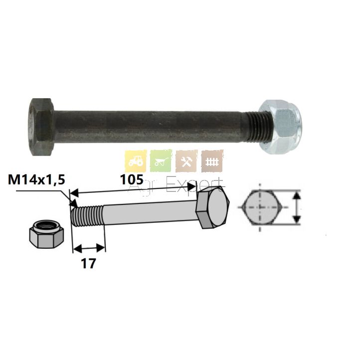 Boulon M14x105 avec écrou pour marteau de broyeur Müthing, Bombord, Spearhead, M14 x 1,5 x 105 mm, 10.9