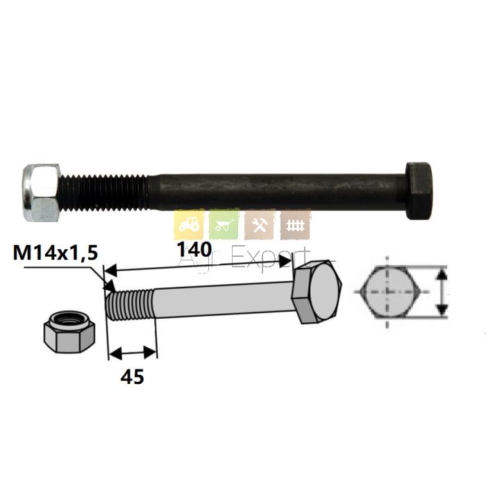 Boulon M14x140 avec écrou pour marteau de broyeur Bombord, M14 x 2 x 140 mm, 10.9