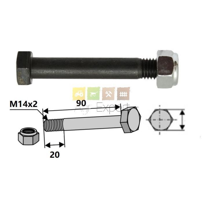Boulon M14X90 pour marteau de broyeur Agrimaster, Agromec, Quivogne, Noremat, Falc, Herder, Gilbers, Turner, Votex, M14 x 2 x 90 mm, 12.9