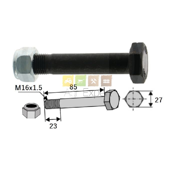 Boulon M16 x 1.5 x 85 mm 10.9, taille de clé/SW 27 - longueur de filetage 23 mm, avec écrou autobloquant
