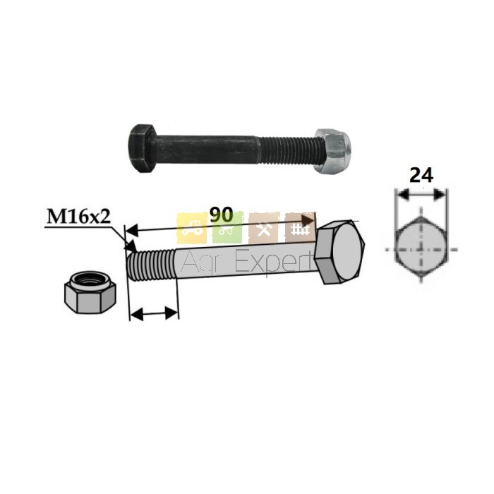 Boulon M16x90 pour marteau de broyeur Agrimaster, Bomford, Ungarn, Omarv, Maletti, Szolnoki, M16 x 2 x 90 mm, 10.9