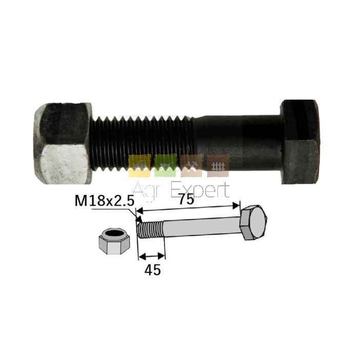 Boulon M18 x 2,5 x 75 mm, 8.8 longueur du filetage 45 mm pour marteau de broyeur