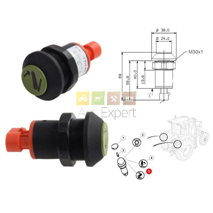tension de commutation 48 V bouton vert, contact à fermeture course totale du bouton de commutation : 5 mm fiche Ø 30 mm (AMP Superseal 3 x 1,5), protection contre la poussière et les éclaboussures