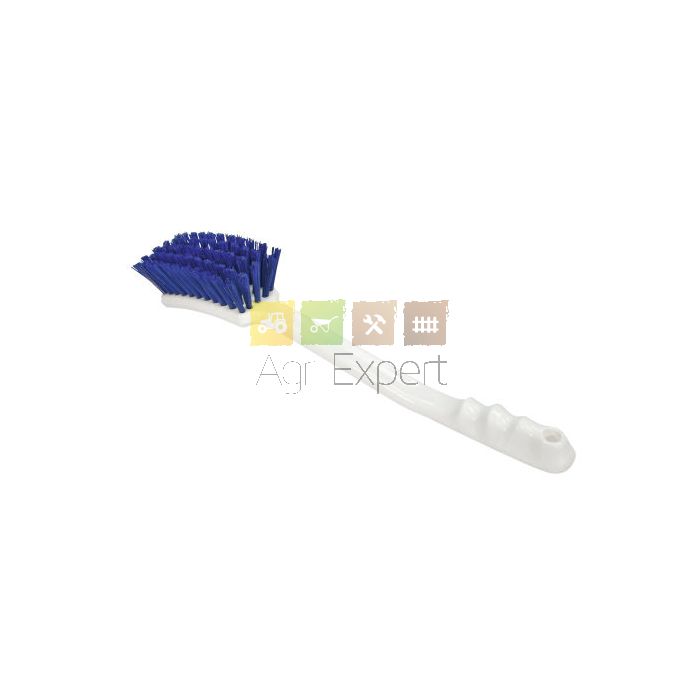 Brosse avec manche ergonomique et poil en polyester bleu.