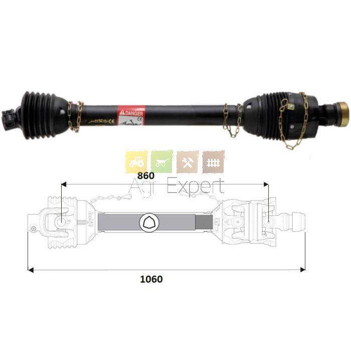 Cardan transmission grand angle B6 homocinétique 80° longueur 1M croisillon 27x92 - 30,2x100 mm tube profil triangulaire système Italien B6 80°
