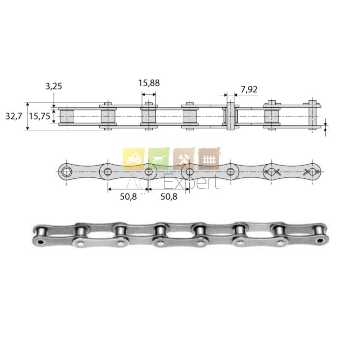 Chaine pas long ( pas 50,8 x largeur 32,7 x diamètre 15,88 mm ) prix au mètre