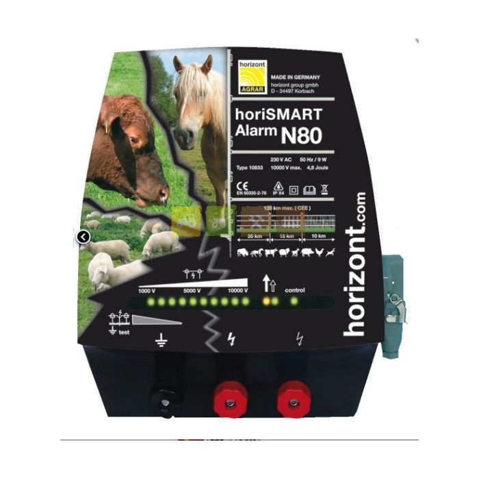 Electrificateur secteur 230 volts 6,8 joules modèle horiSMART N80 Alarm équipée de 2 sorties tension et d'une prise d'alarme en plus. Une sortie de puissance forte et une sortie de puissance faible.• Effet turbo pour une puissance supplémentaire (p. ex. en cas de court-circuit sur la clôture) Sur demande, les alarmes horiSMART peuvent être configurées de telle sorte qu'un fontionnement avec boucle de clôture soit possible. Dans ce cas la tension de l'extrémité de boucle de clôture est affichée par l'appareil. Prenez contact avec nous !