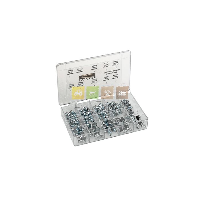 Coffret composés de 110 graisseurs droits et coudés 45° et 90°, acier galvanisé et passive.