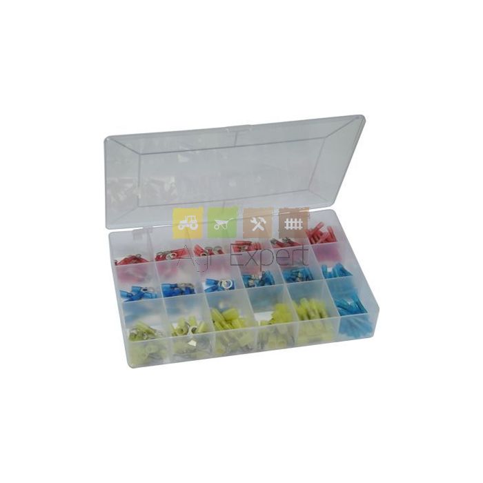 10 x cosses à œil rouges Ø 5, 10 x cosses à œil rouges Ø 6, 15 x cosses plates mâles rouges 6.35, 15 x cosses plates femelles rouges 6.35, 25 x raccords bout à bout rouges 15 mm, 25 x raccords bout à bout bleus 15 mm, 15 x cosses plates mâles bleues 6.35, 10 x raccords bout à bout jaunes 15 mm, 10 x cosses plates mâles jaunes 6.35, 15 x cosses plates femelles bleues 6.35, 10 x cosses plates femelles jaunes 6.35, 10 x cosses à œil jaunes Ø 10, 10 x cosses à œil jaunes Ø 8, 10 x cosses à œil bleues Ø 6, 10 x cosses à œil bleues Ø 5, 10 x cosses à œil jaunes Ø 6.