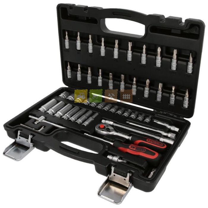 Coffret de 53 douilles et accessoires en acier Chrome Vanadium, finition satinée.