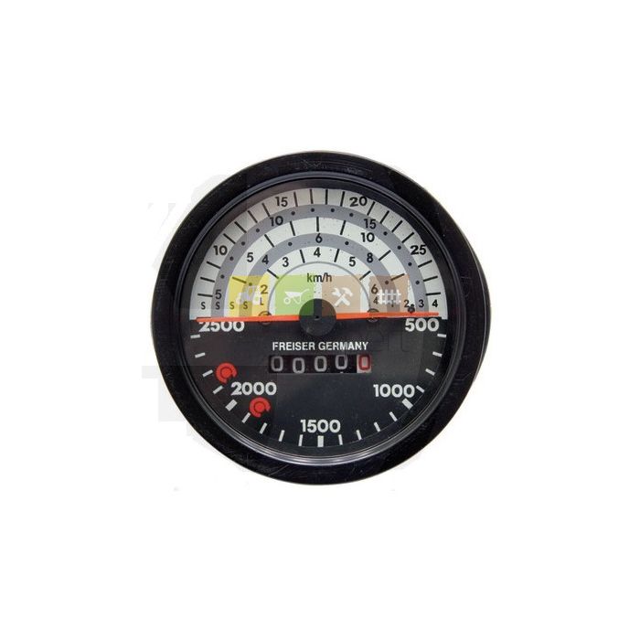 Caractéristiques : Ø 100 mm, encadrement noir, 0-30 km/h, 500-2500 t/min, sans témoin lumineux, raccord câble 45°.