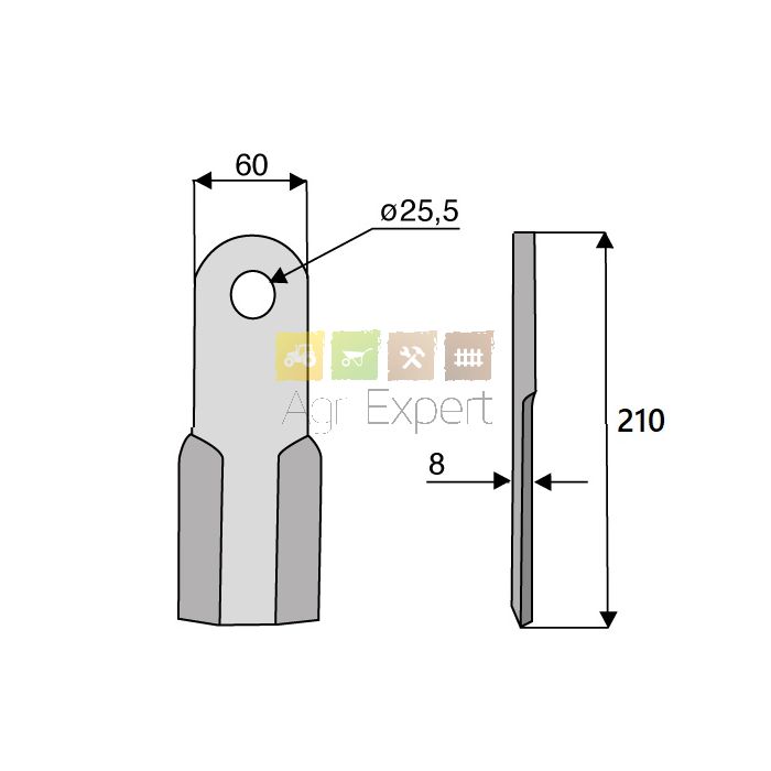 Couteau droit 60x8x210 D25.5 broyeur Maschio, Beccio, Palladino, Pegoraro, Quivogne