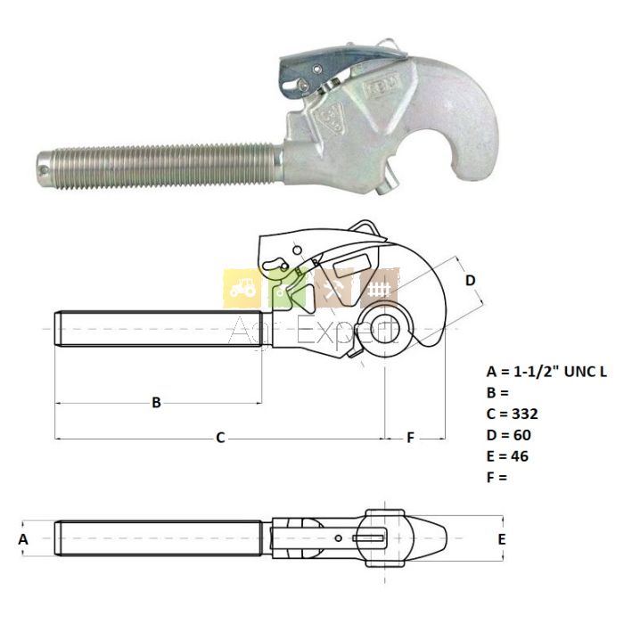 Crochet de barre de poussée CBM filetage de la tige 1"1/2, longueur 332 mm filet gauche.