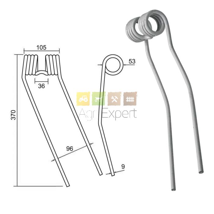 Dent de faneuse Fahr KH 2 N, KH 4 N, KH 6 N (àpd 1966), KH 2, KH 6 (jusqu'en 1966), VF06580391, L370 D9mm gauche