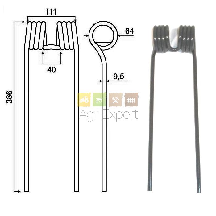 Dent de faneuse andaineur Girostar Kuhn GRS20, GRS21 référence 57601100, L386 D9,5mm