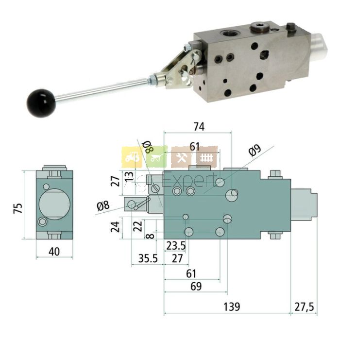 Caractéristiques techniques: pression max.: 210 bars débit max.: 40 l/min. couple de serrage: 30 Nm raccords: M 18 x 1.5 dimensions: 180 x 40 x 75 mm