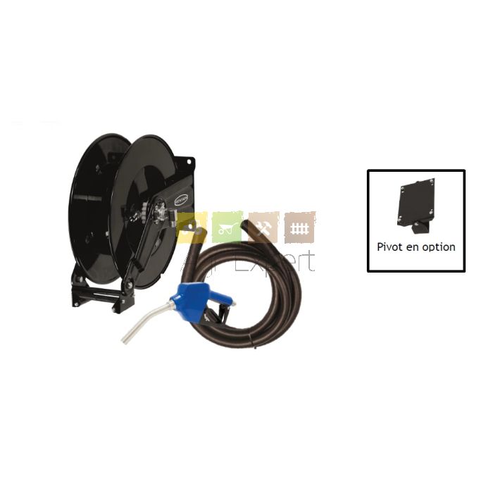 Enrouleur acier peint équipé de 10m de flexible EPDM spécial ADBlue et pistolet automatique pour ADBlue.