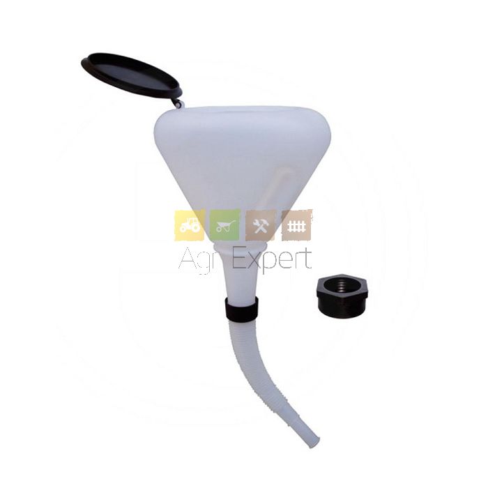 Entonnoir avec tamis, couvercle anti-poussière et bec flexible.