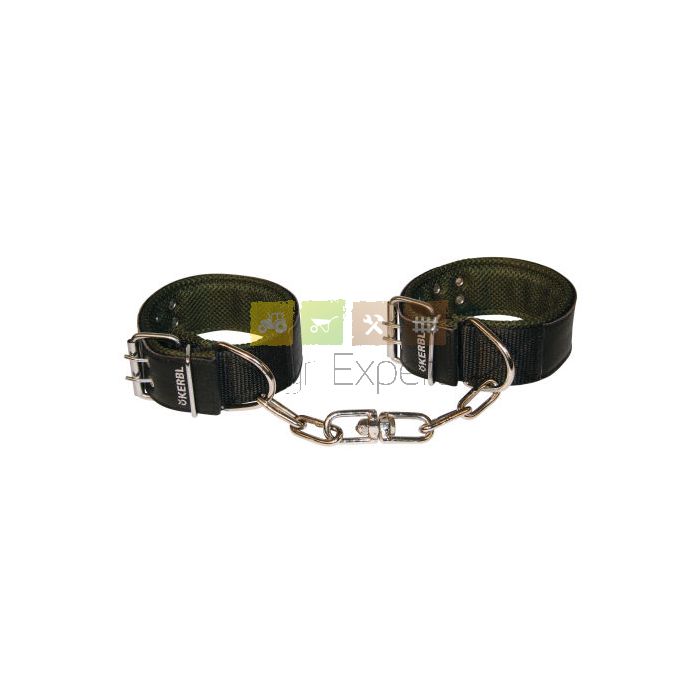 Entraves rembourrées en polyester. Elles respectes vos animaux grâce au rembourrage. Les émerillons empêchent un enchevêtrement de la chaîne. Elles évitent les blessures et facilitent le relevage de la vache après le vêlage.