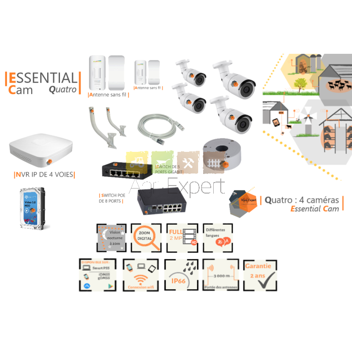 | ESSENTIAL' Cam Quatro| Dispositif de vidéosurveillance complet comprenant 4 caméras Essential' Cam Visio Expert