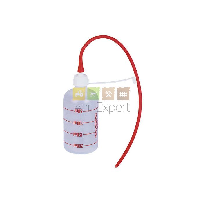 Flacon pélican pour alimentation des agneaux. La bouteille est fermée et est à destination des liquides.
