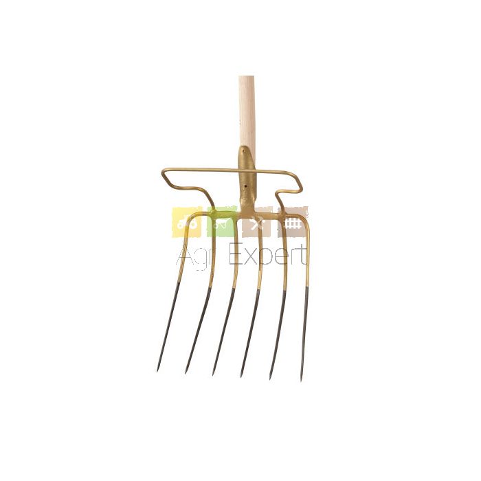 Fourche à ensilage de 6 dents en acier de qualité supérieure avec partie cintrée. Dimension : 36 x 33 x 27 cm. Livrée sans le manche vendu séparément.
