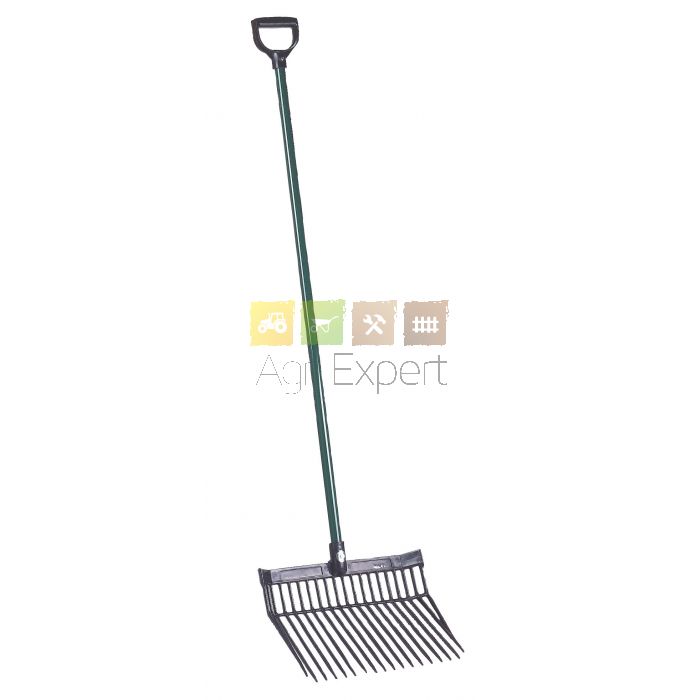 Fourche d'écurie en PVC très robuste avec manche. Sa forme incurvée et ses 17 dents de 33 cm de longueur la rende très agréable d'utilisation. Le manche métal avec la poignée en forme de D offre un bon maintien. Largeur 41 cm.