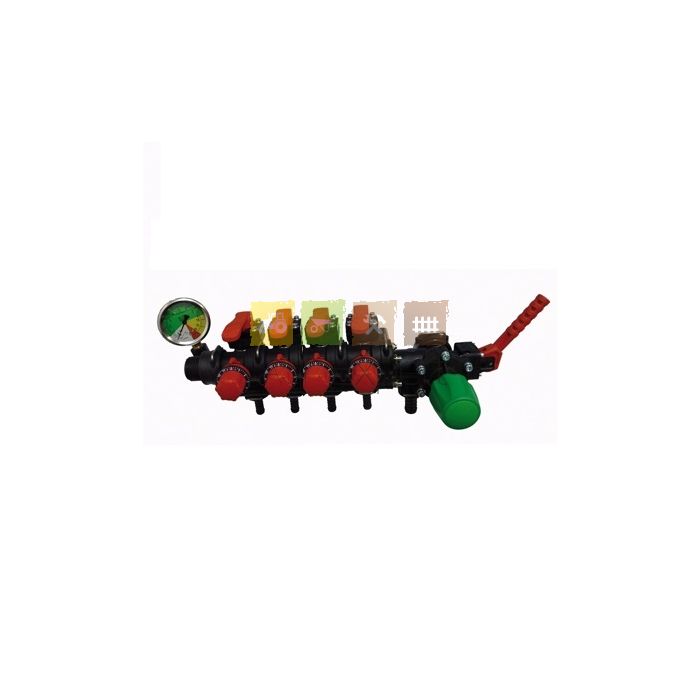 Vanne général manuel entrée diamètre 19 mm + vanne régulatrice mécanique avec retour cuve diamètre 25 mm , 1 retour compensé diamètre 25 mm + 4 vannes de section avec raccord diamètre 13 mm + filtre 160 l /min.
